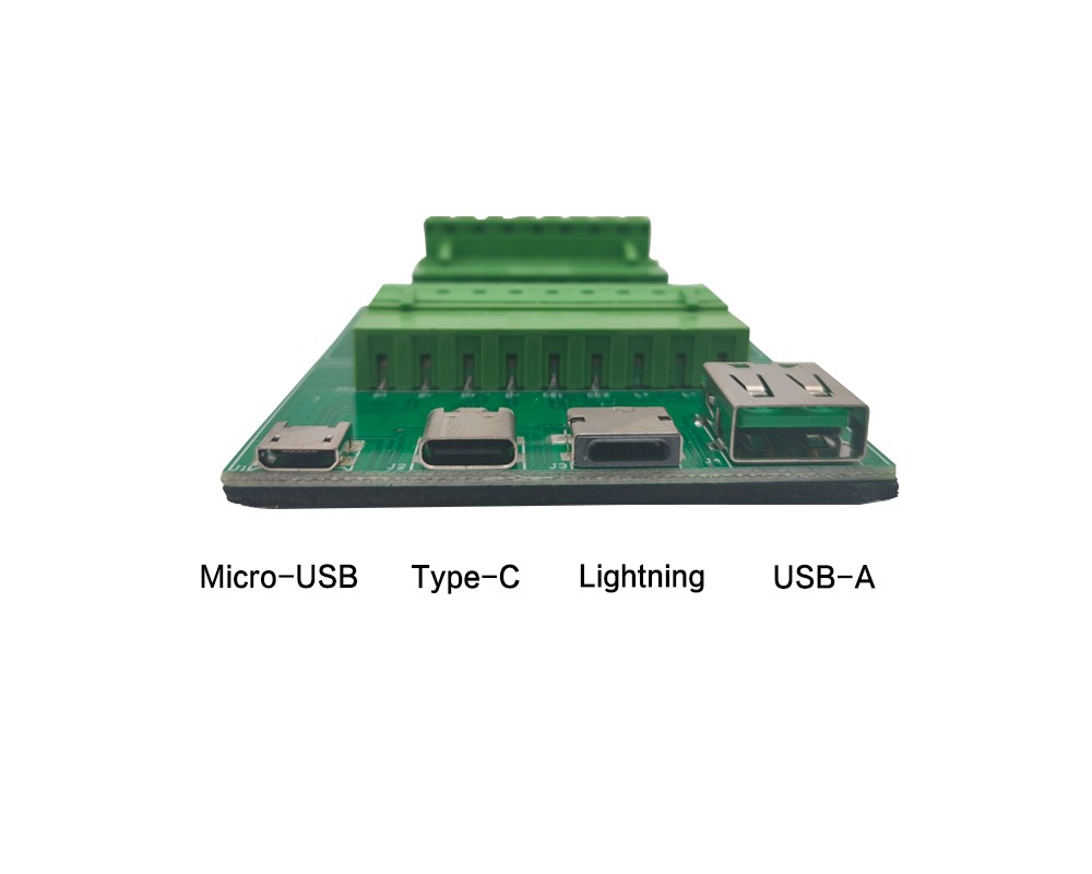 本產(chǎn)品為CH9722P標配轉(zhuǎn)接板,可進行USB口、A口以及C口和Lightning口的快充測試,自帶蘋果解碼芯片